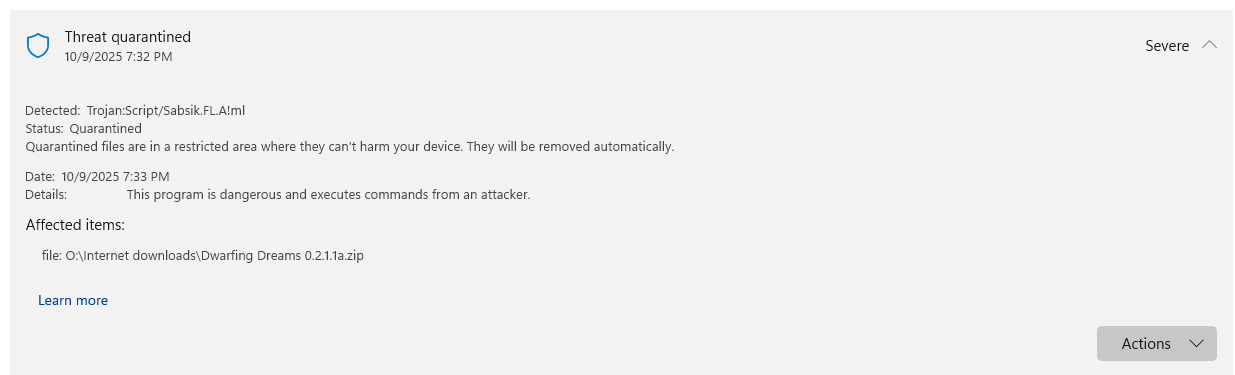 It’s a common issue with Unity and other indie games. The file isn’t malicious; it just trips defender’s automated machine-learning scan because it’s an unsigned executable (not verified by Microsoft) and packed in a ZIP file. The file is not malicious though I can verify.